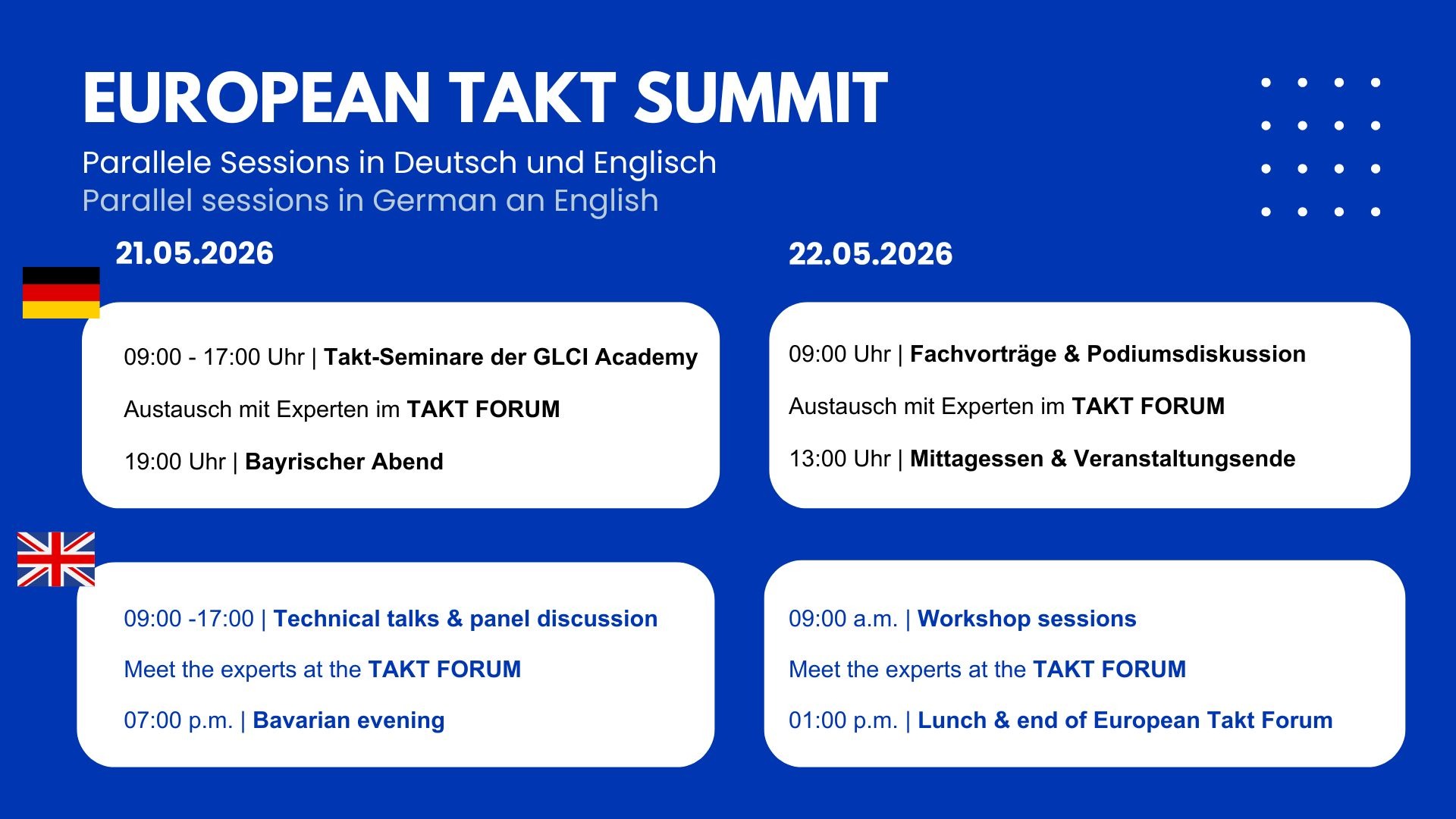 Der erste europäische Takt-Summit ermöglicht einen Austausch zu Status Quo und aktuellen Innovationen. Praxisnah, relevant und zukunftsweisend. Treffen Sie internationale Takt-Experten, tauschen Sie sich aus und lernen Sie Best Practices aus der Praxis. Die Veranstaltung bietet parallele Sessions in Deutsch und Englisch.