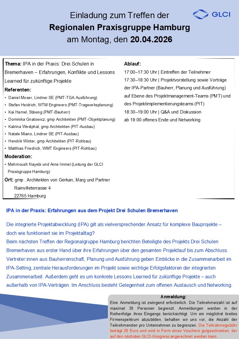 am 20. April 2026 trifft sich die Regionale Praxisgruppe Hamburg bei gmp Architekten von Gerkan, Marg und Partner in Hamburg.