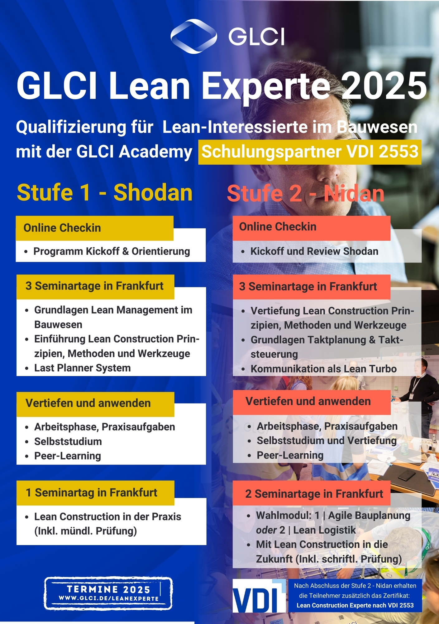 Die Ausbildung zum GLCI Lean Experten ist ein Angebot der GLCI Academy für alle Lean-Interessierten im Bauwesen. Ziel der Fortbildung ist es, Sie zu befähigen, die Potentiale des Lean-Managements zu erkennen und in Ihrem Arbeitsumfeld zu erschließen. Das Zertifkatsprogramm wurde von erfahrenen Experten aus der Lean Construction Community entwickelt und bietet ein breites Spektrum an praxiserprobtem Know-how.